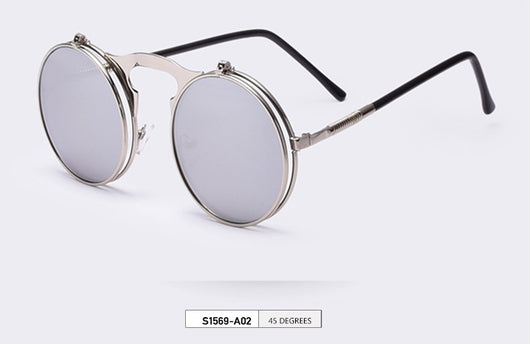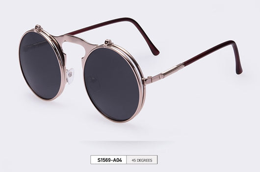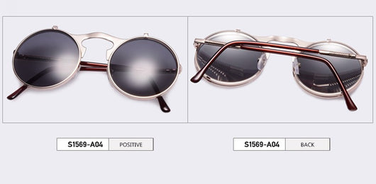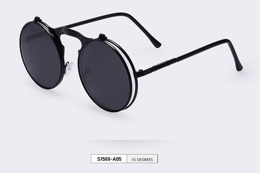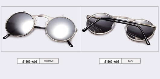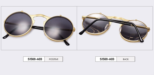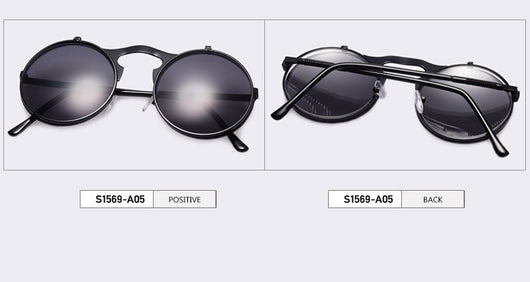 Featuring a retro punk look with large, round UV protection lenses that can be pulled up to expose your eyes for that sizzling and stunning style. The nose pads connect to the frame in such a concise arch that gives additional luxury touch. Available in 5 exquisite color combination. Works best when maintaining a stoic, doesn't give a damn face!