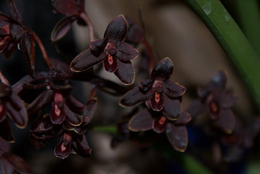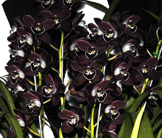 Cymbidium plants are sympodial and grow to a height of 60 cm and the racemes as high as 90 cm. The raceme grows from the base of the most recent pseudobulb. Each flower can have a diameter of 5 to 10 cm, according to the species. They bloom during the winter, and each plant can have up to fifteen or more flowers. The fantastic range of colors for this genus include white, green, yellowish-green, cream, yellow, brown, pink, and red [and orange] and black (and there may be markings of other color shades at the same time), but not blue. The flowers last about ten weeks. They have a waxy texture. The rounded sepals and petals have about the same dimensions. There are fragrant varieties as well, notably the Chinese cymbidiums. They have been cultivated for thousands of years, especially in China. Cymbidiums became popular in Europe during the Victorian era. One feature that makes the plant so popular is the fact that it can survive during cold temperatures (as low as 7˚ C or 45˚ F) [Actually they will survive at temperatures below 32˚F for short periods and even as low as 28˚F]